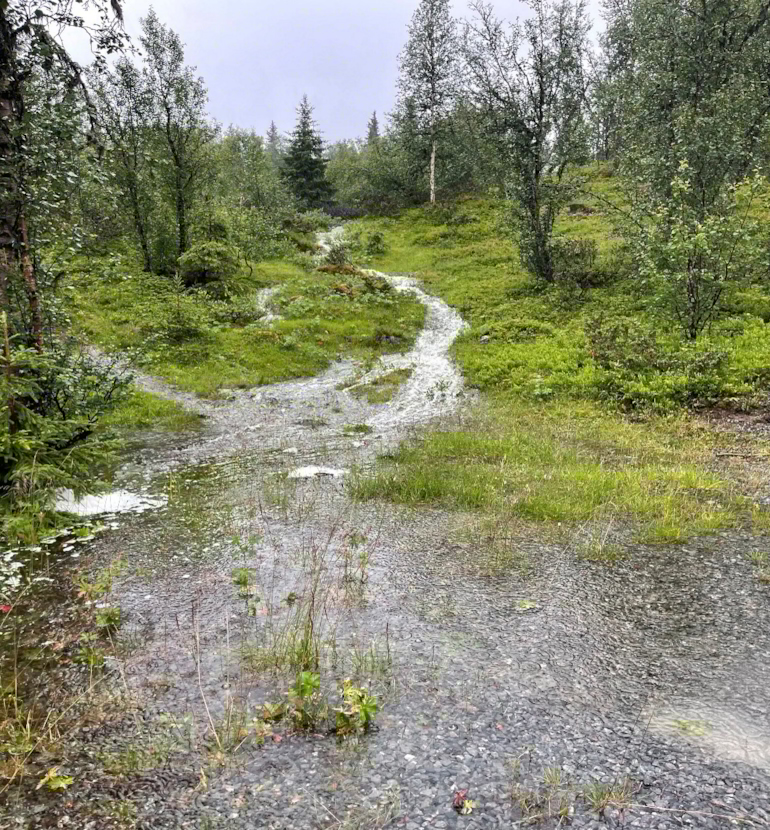En erstatningsbetingende flom kan også oppstå når ekstraordinær, naturlig avrenning danner villbekker i skrånende og uberørt terreng.